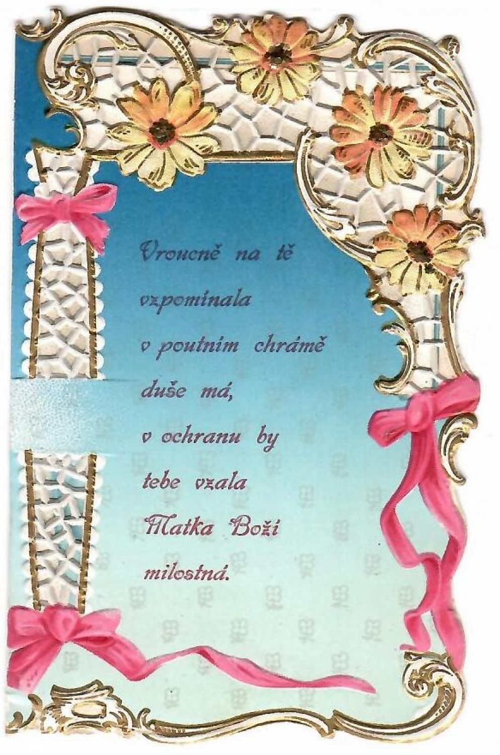 Přední deska s krajkovým papírem, uvnitř barevná reprodukce Panny Marie, na zadní desce česky psaný text.