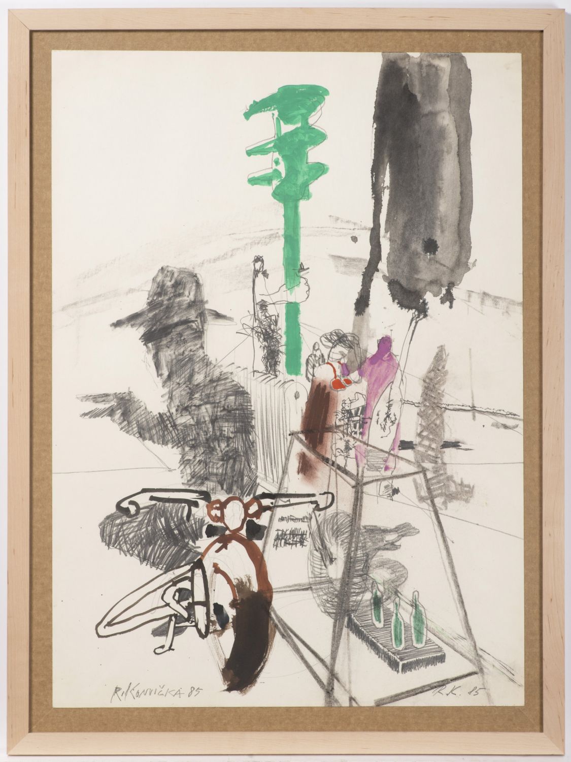Kombinovaná technika na papíře, autorem vpravo dole tužkou monogramem podepsaná a datovaná, vlevo dole podpis celým příjmením a datace. Zarámováno ve světlém přírodním rámu o rozměru 695 x 520 mm bez pasparty.