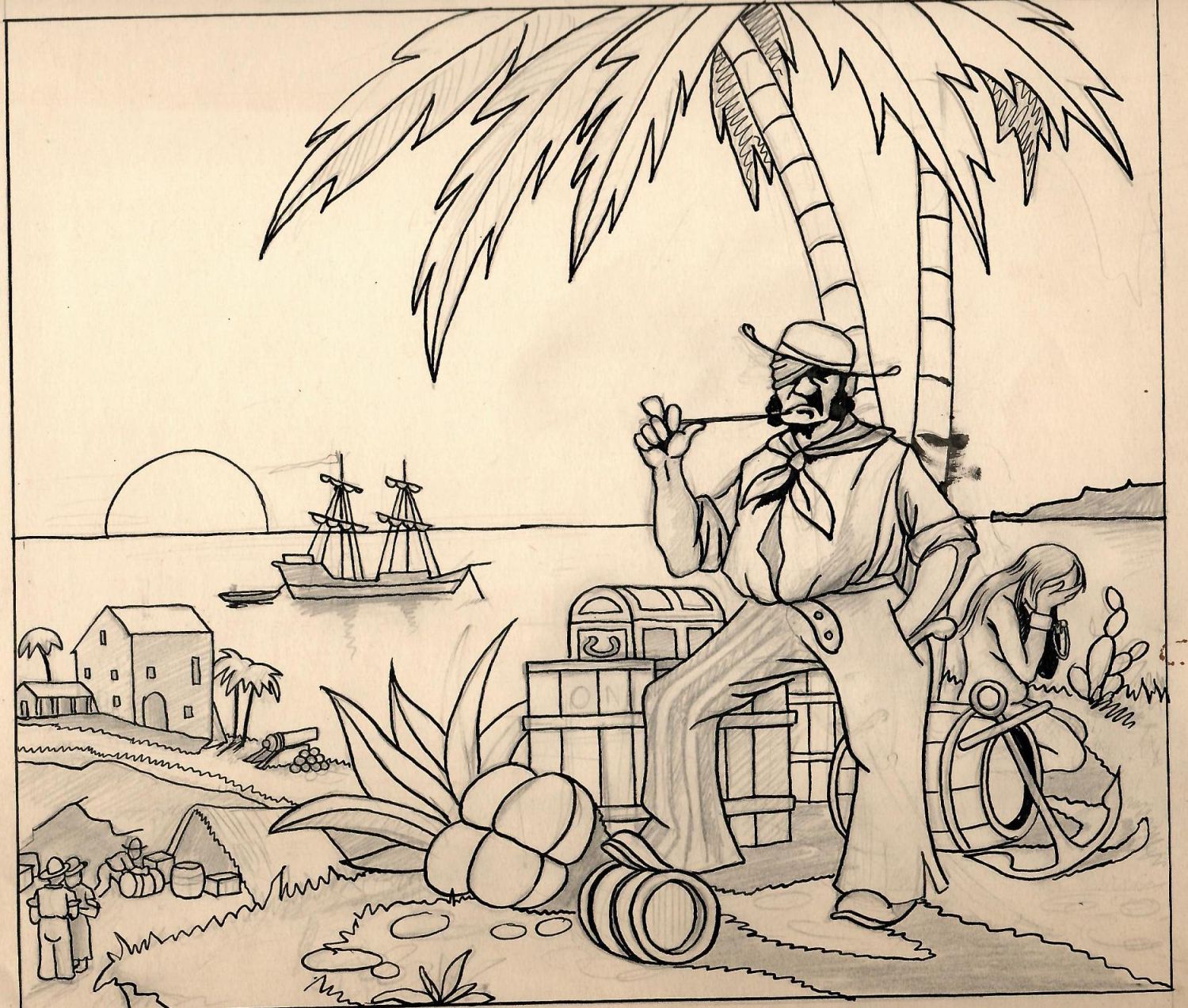 Ilustrace. Kresba tužkou a perem o rozměru 200 x 230 mm na papíře 234 x 260 mm. Na rubu papírový štítek s autorovým jménem.
