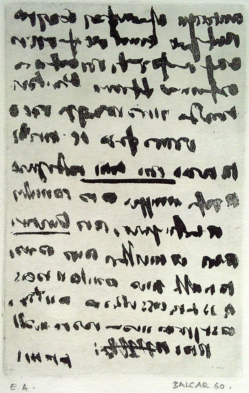 Původní akvatinta o rozměru desky 245 x 157 mm, vpravo dole tužkou signovaná a datovaná "60", vlevo dole tužkou "E. A." (první otisk); volný list 518 x 320 mm, při spodním okraji tužkou název a datace 1959. Reprodukováno v monografii Marie Klimešové a Jana Rouse "Jiří Balcar", str. 77, obr. 65. - Provenience: zakoupeno od autorova syna.