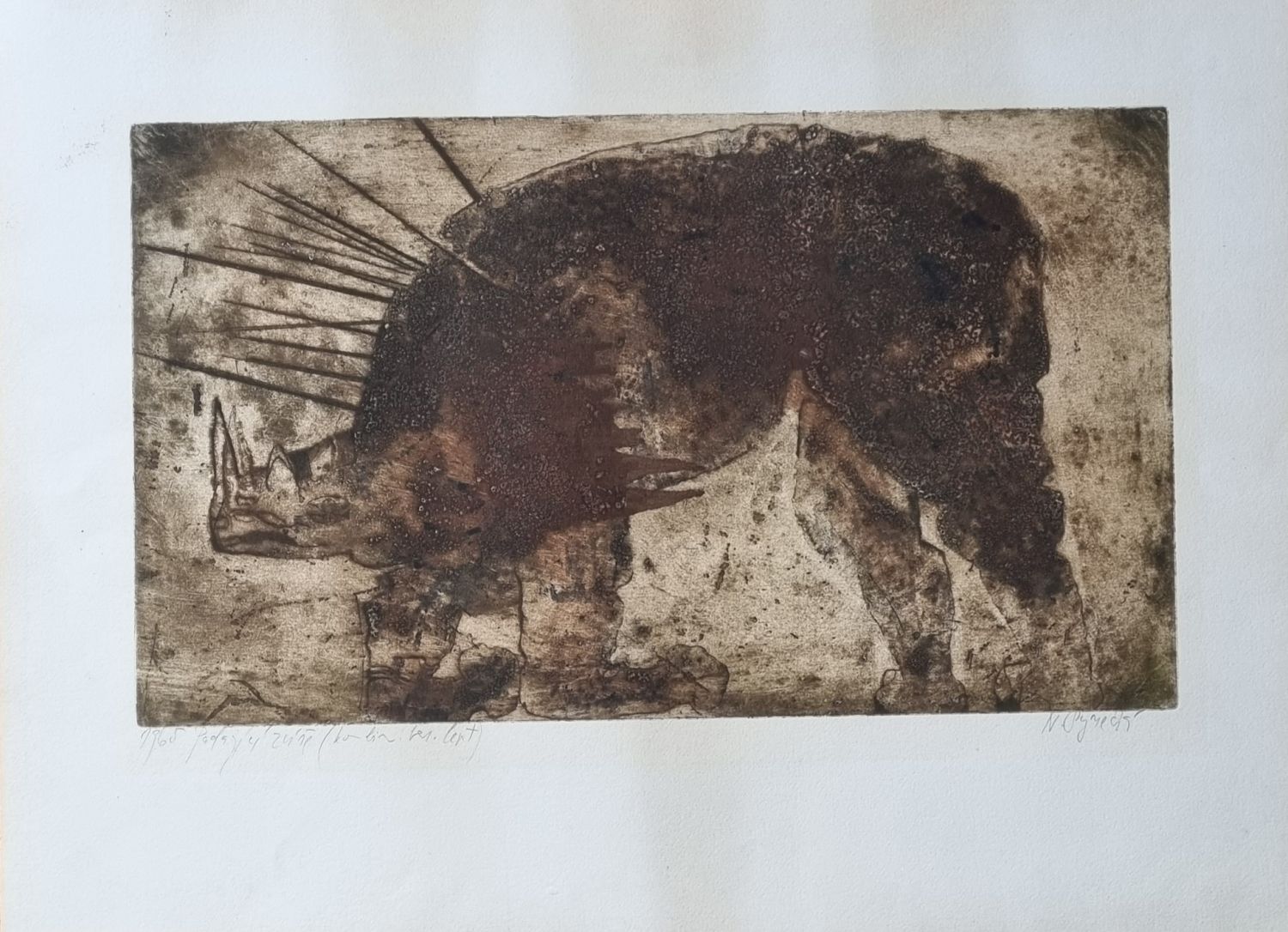Strukturální grafika s barevným leptem, vpravo dole autorkou tužkou podepsaná, vlevo dole autorkou datováno, uveden název díla a výtvarná technika. Volný list. Papír lehce zahnědlý.
