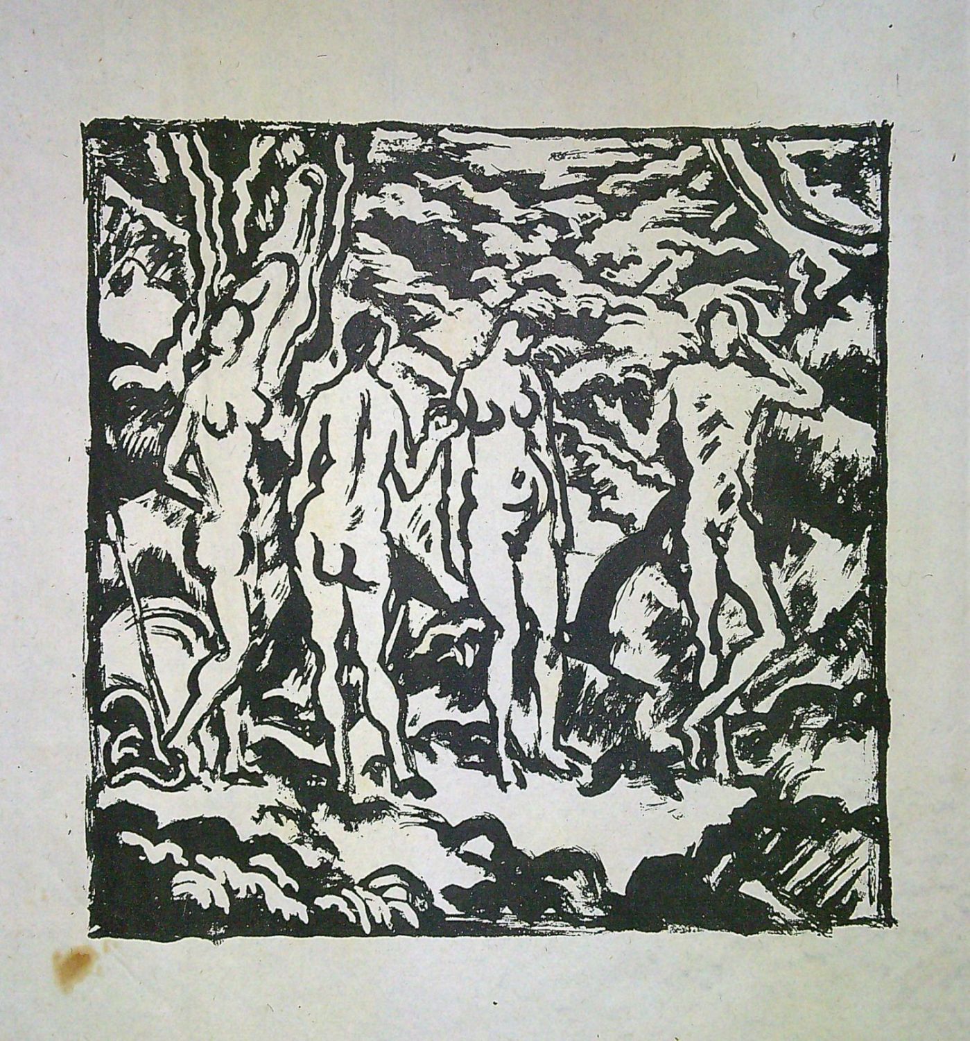 Štětcová litografie tištěná na jemném rýhovaném papíře. Volný list autorem nepodepsaný. Okraje papíru neoříznuté, papír v pravé části přes celou výši lehce přeložený a při horním okraji lehce pomačkaný (bez zásahu do tisku), vlevo pod deskou hnědá skvrnka (bez přesahu do vlastního tisku).