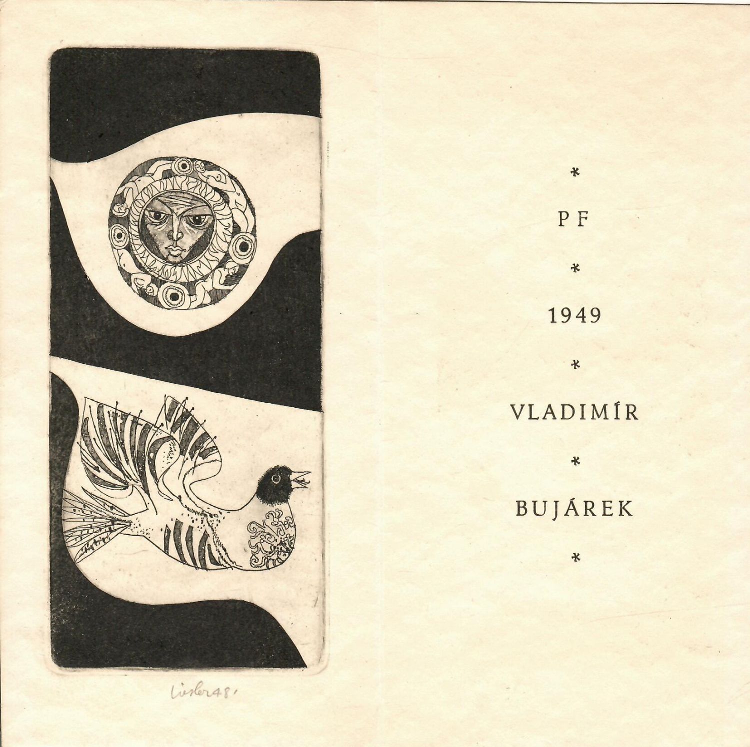 Původní lept autorem tužkou pod deskou podepsaný a datovaný. Původní dvoulist, na levé části lept, v části pravé tištěné Bujárkovo PF.