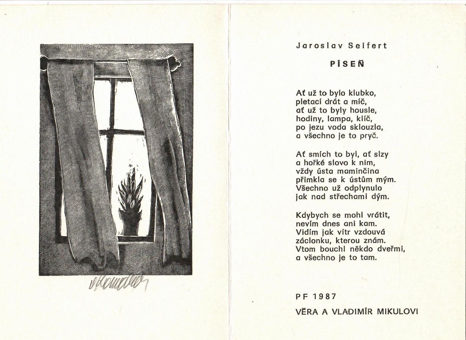 Dřevoryt, při spodním okraji tisku autorem tužkou signováno. Na protější straně listu báseň od Jaroslava Seiferta.