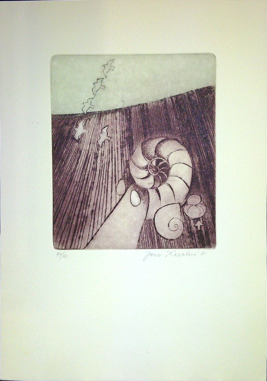 Suchá jehla o rozměru tisku 153 x 129 mm. Autorkou při spodním okraji tisku tužkou signováno, datováno a číslováno. Č.ex. 44/60.