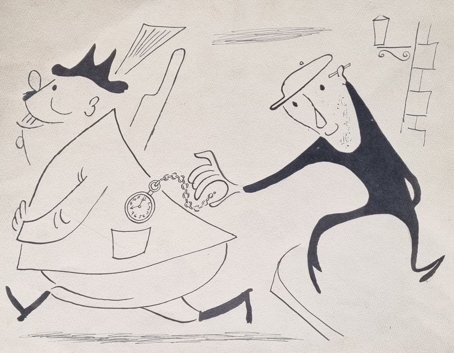 Kresba tuší. Kresba byla otištěna v časopise "Ahoj" (1933 - 1943). Na zadní straně listu text "Podzimní úlovek" a a "Ahoj, str. 6". Nesignováno. Volný list.