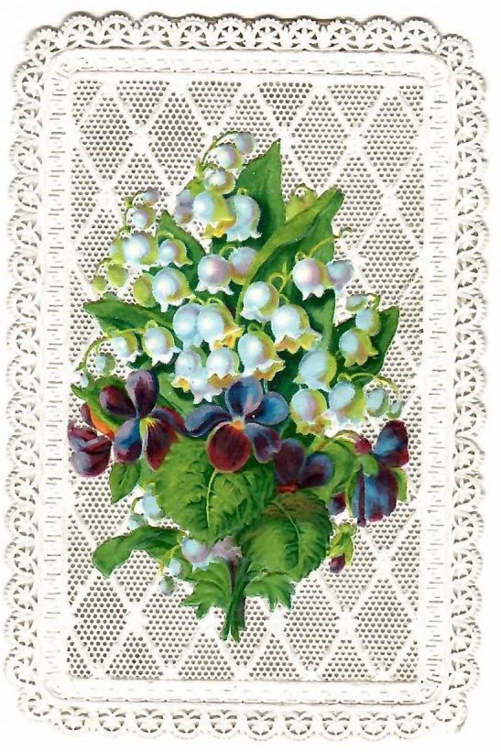 Papír napodobující krajku, na kterém je nalepen obrázek konvalinek s violkami. Po odklopení konvalinek se objeví nápis "Ich gratulire". Zadní strana popsána.