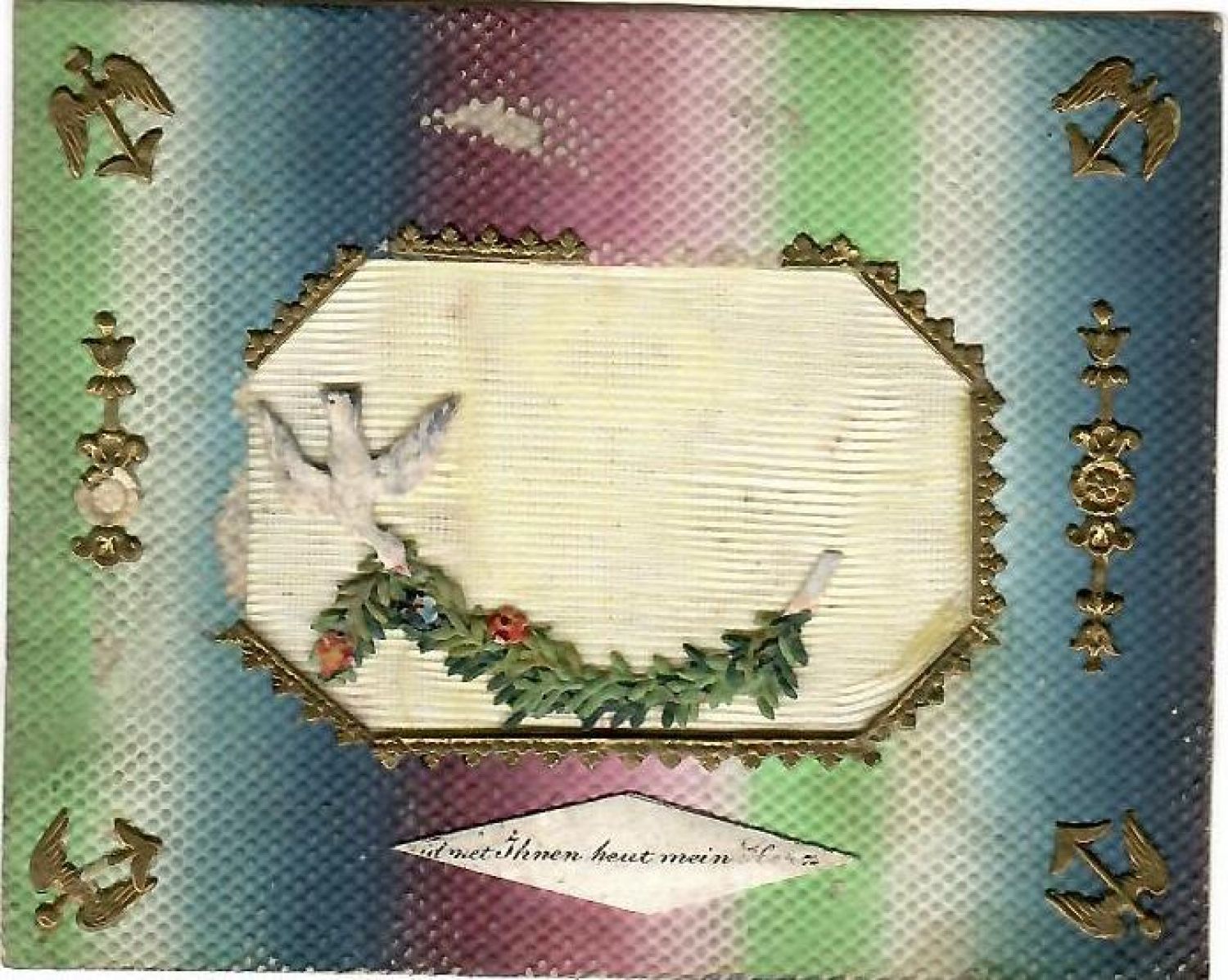Přání s dolepovanými zlacenými ozdobami. Okénko podlepeno drobnou síťkou ve žluté barvě. Na síťce nalepena holubice držící v zobáku květinový pás. Druhá holubice chybí. Okénko lemováno zlacenou krajkou, místy krajka chybí. Zadní strana popsána.