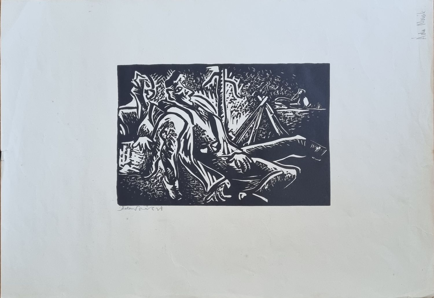 Linoryt, list. č. 7. Autorem při spodním okraji tisku tužkou signovaný. List při okrajích místy lehce pomačkaný a drobně natržený.
