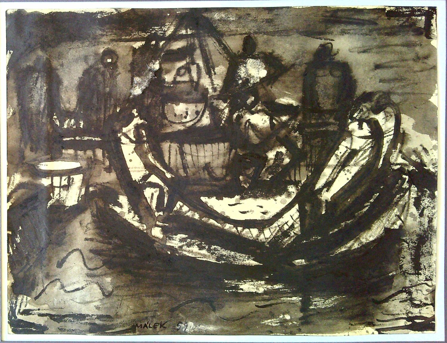 Lavírovaná kresba tuší na papíře. Volný list, uprostřed dole autorem tuší podepsaný a datovaný. Na rubu autorem napsaný název a několik jeho rukopisných poznámek.
