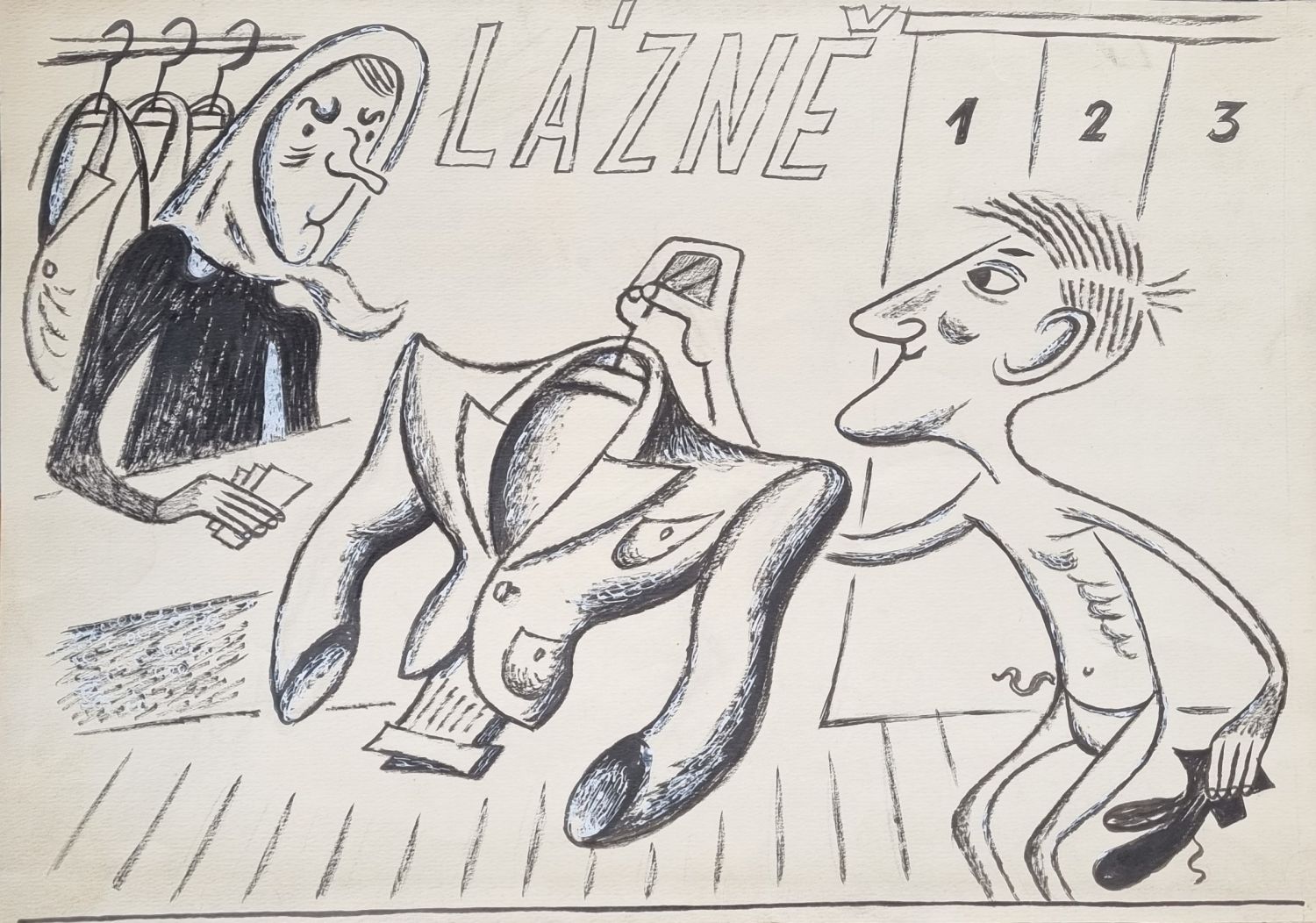 Kresba tuší a bílou temperou. Kresba byla otištěna v časopise "Ahoj" (1933 - 1943). Na zadní straně listu text "Šaty dělají člověka: Paní, pověsejí mně ty svaly!" a "Ahoj, str. 28". Nesignováno. Volný list.