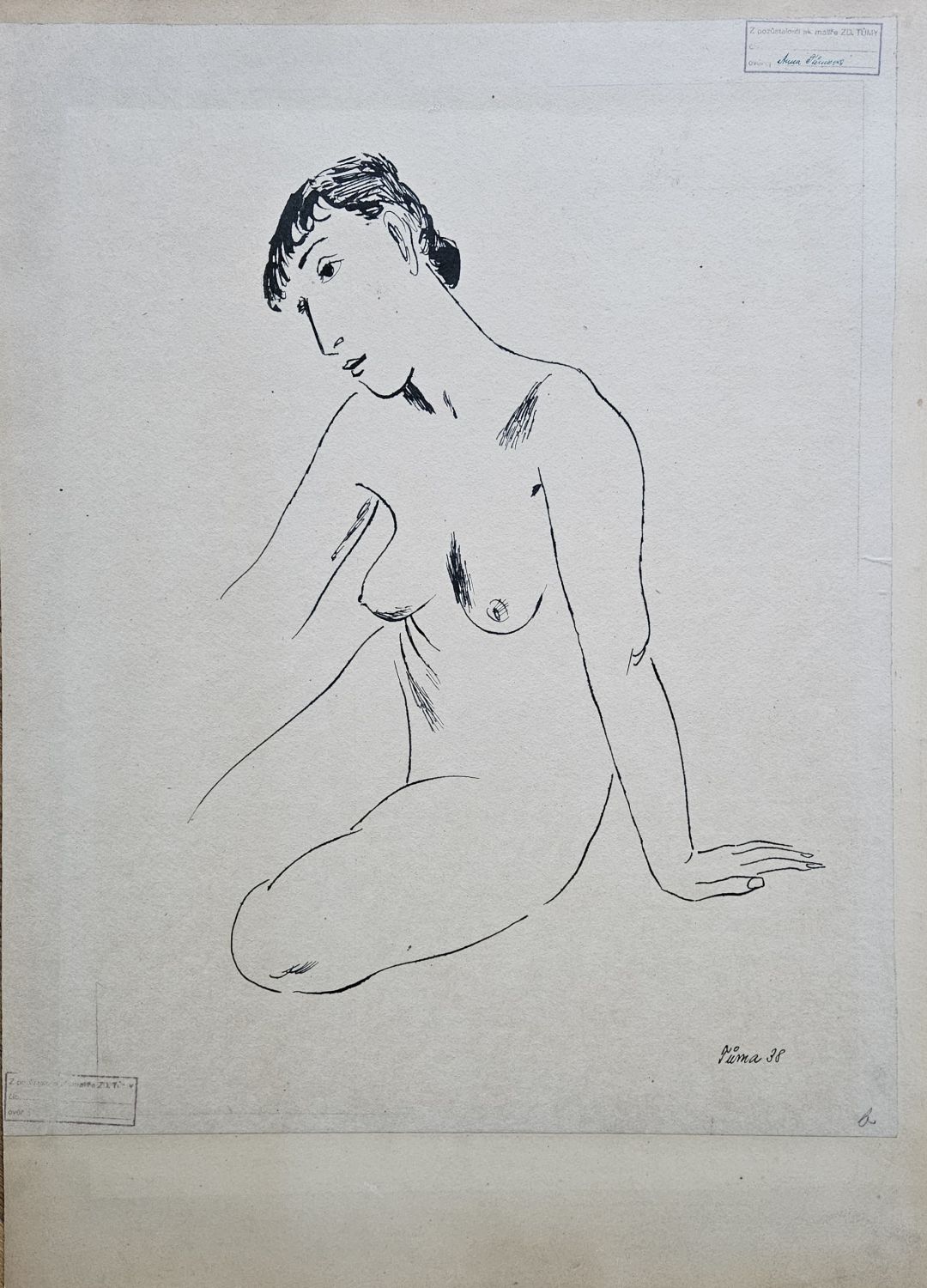 Kresba tuší na papíře nalepeném na podkladovou kartonovou desku (původní autorova adjustace), vpravo dole autorem perem podepsaná a datovaná. Při horním vnějším okraji a spodním vnitřním stará razítka "Z pozůstalosti malíře Zd. Tůmy". Provenience: práce byla zakoupena od paní docentky MUDr. Zity Miřatské, sestry Zdeňka Tůmy.