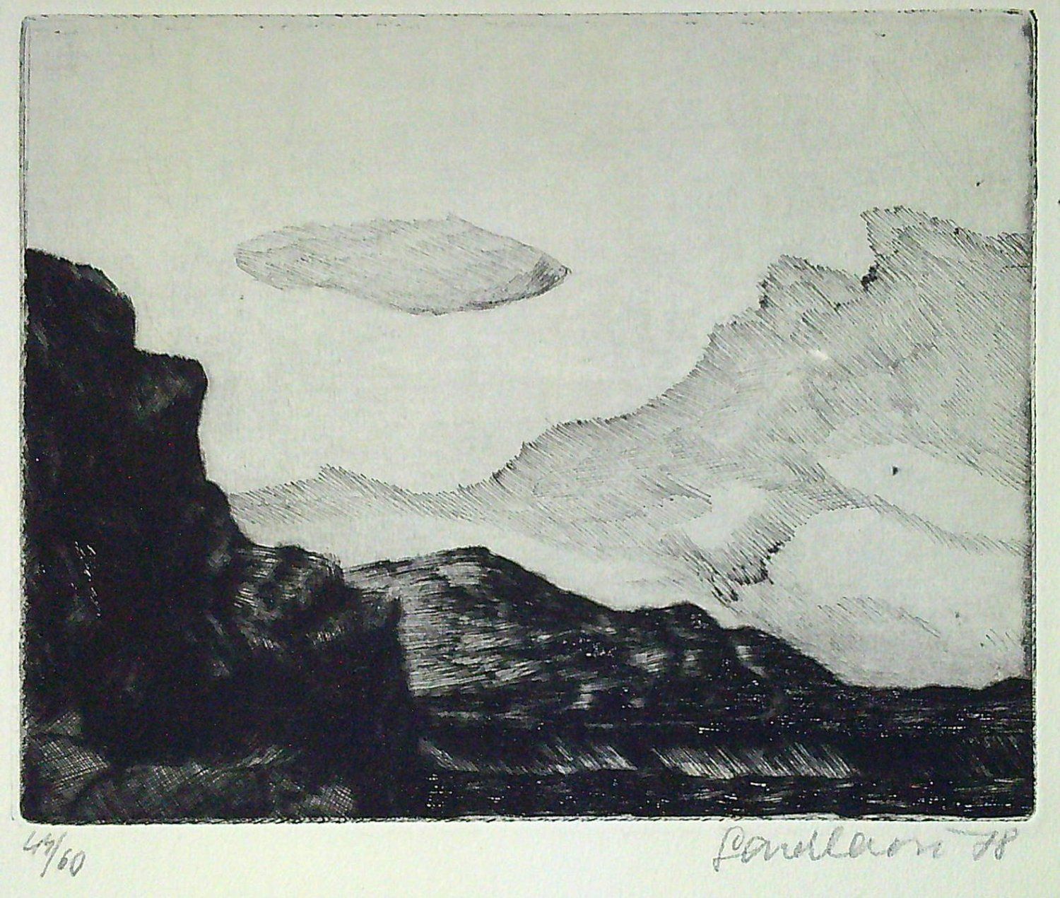 Původní suchá jehla o rozměru desky 132 x 170 mm, vpravo dole autorkou tužkou podepsaná a datovaná, vlevo dole číslovaná 44/60. Volný list 210 x 300 mm.