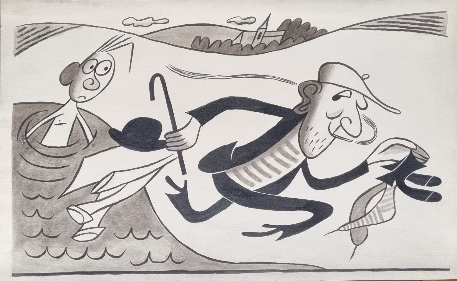 Kresba tuší. Kresba byla otištěna v časopise "Ahoj" (1933 - 1943). Na zadní straně listu text "Skromné přání: Pane, vraťte mi ašpoň ty falešný žuby čo šou v kapše u vešty!" a "Ahoj, str. 28". Nesignováno. Volný list.
