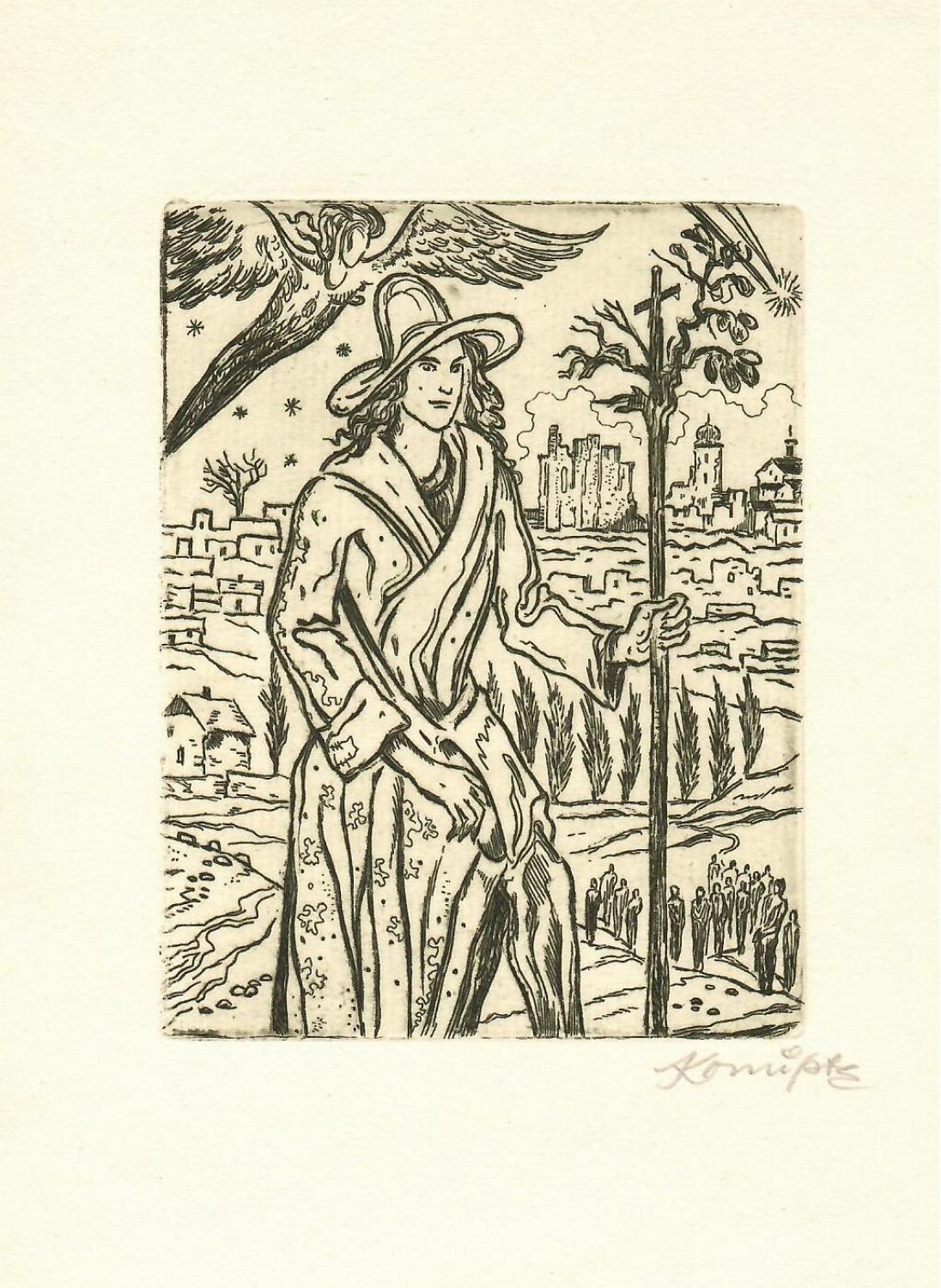Lept. Autorem při spodním okraji tisku tužkou signováno. Volný list, frontispis z knihy Eugena Demoldera "Štědrý večer" (nakl. Josef Portman).