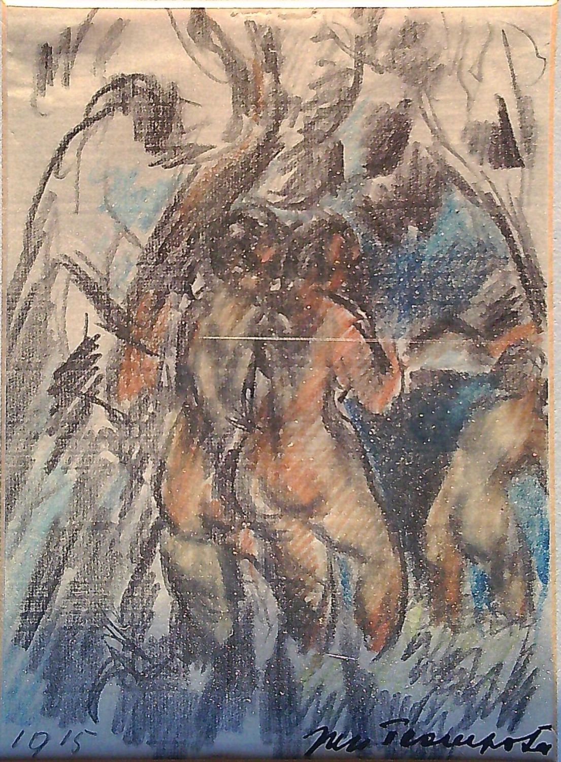Kresba tužkou a barevnými pastelkami, vpravo dole autorem černým perem podepsaná, vlevo dole autorem tužkou datovaná. - Práce je vložena v hluboké kartonové paspartě a zasazena do béžového dřevěného rámu se zlacenými linkami.