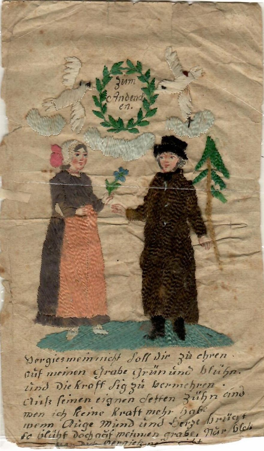 Vyšívané přání s kresbou na papíře s německým textem.