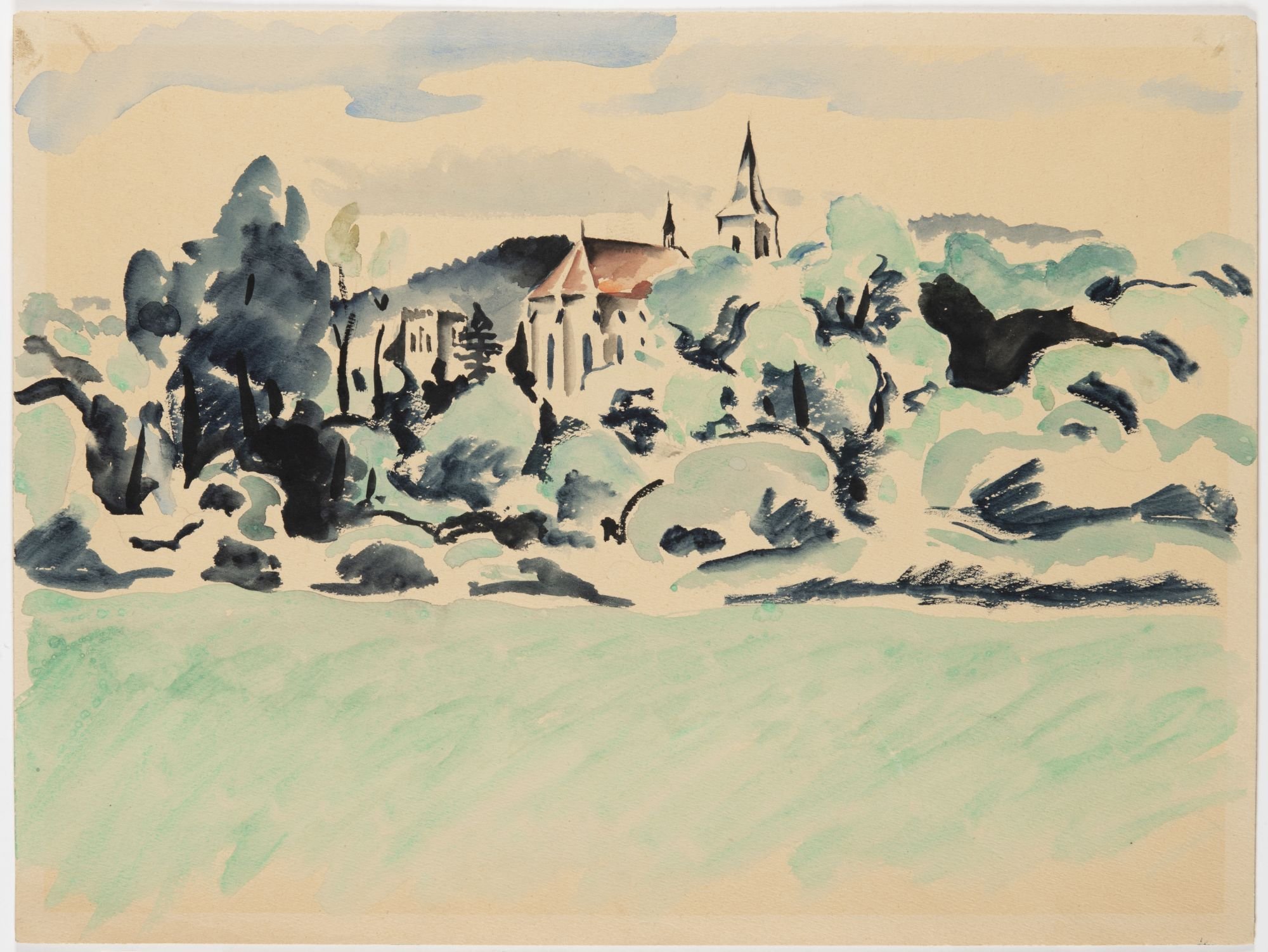 Akvarel na papíře. Práce je opatřena hlubokou paspartou a světlým přírodním rámem z olše. Na rubu pozůstalostní razítko. Akvarel pochází z pozůstalosti Bedřicha Feuersteina.