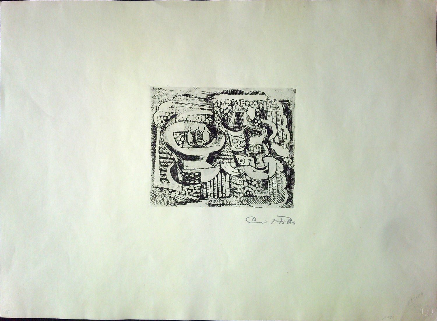 Původní lept autorem vpravo dole pod deskou tužkou podepsaný. Jeden z 50 tisků, tištěno na tužší papír, v jehož pravém spodním rohu je suché razítko "H ECO". (Berka "Soupis grafického díla E. Filly" č. 15). Práce je olemována paspartou a opatřena jednoduchým černým rámem z přírodního dřeva.