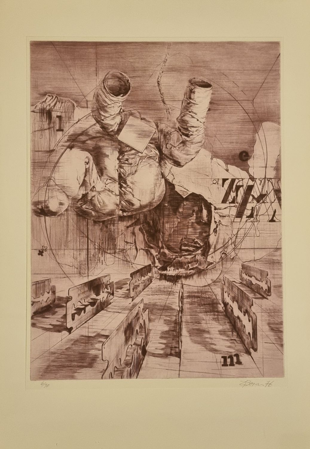 Suchá jehla, autorem vpravo dole tužkou podepsaná a datovaná, vlevo dole číslo tisku 6/30. Volný list při horních rozích přichycený k paspartě.